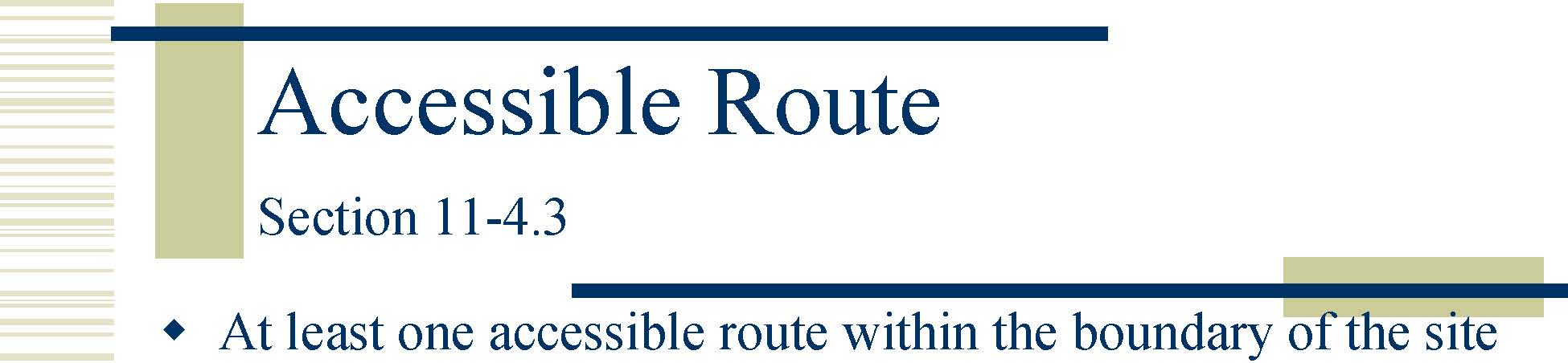 Entrances/Accessible Route: These elements shall be connected to public transportation stops, accessible parking, passenger loading zones, public streets or sidewalks.